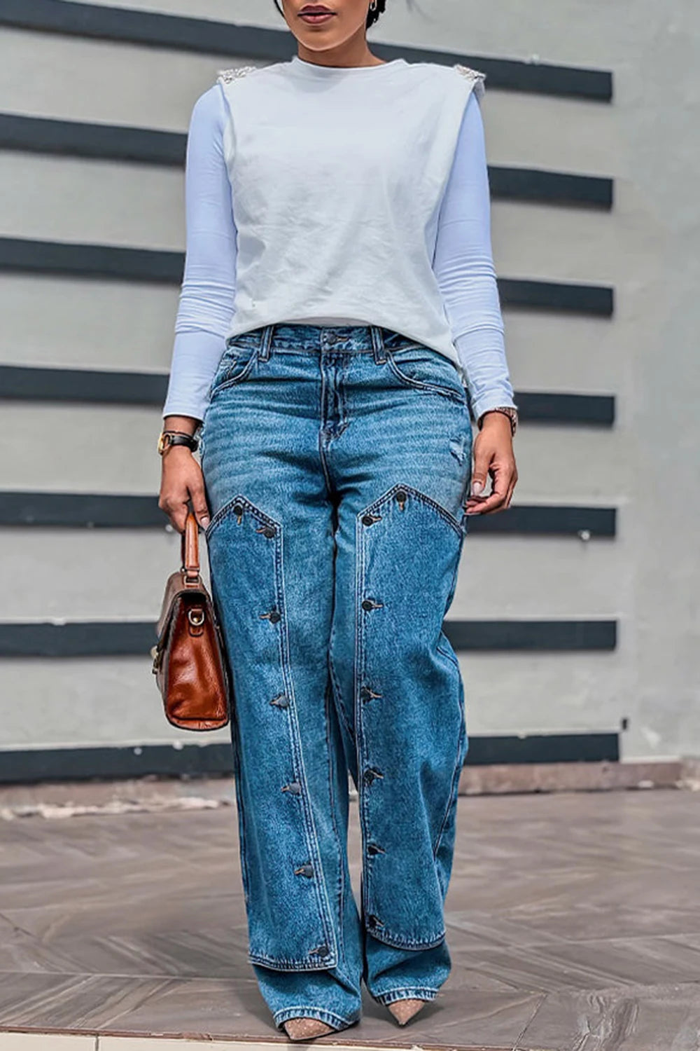 FZ Women's Plus Size Holes Pearls Vintage Cutout High Waist Denim Pants