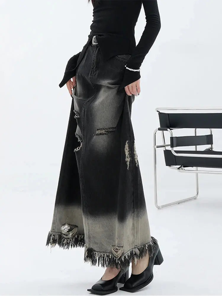 Upgrade your fashion game with FZ Women's Midi A-line Ripped Gradient Denim Skirt.