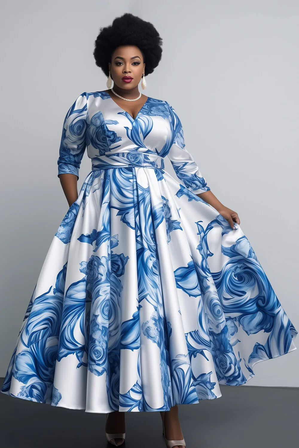 Elevate your wardrobe with the FZ Women's Plus Size Floral V Neck Long Sleeve Pleated Pocket Satin Maxi Dress.