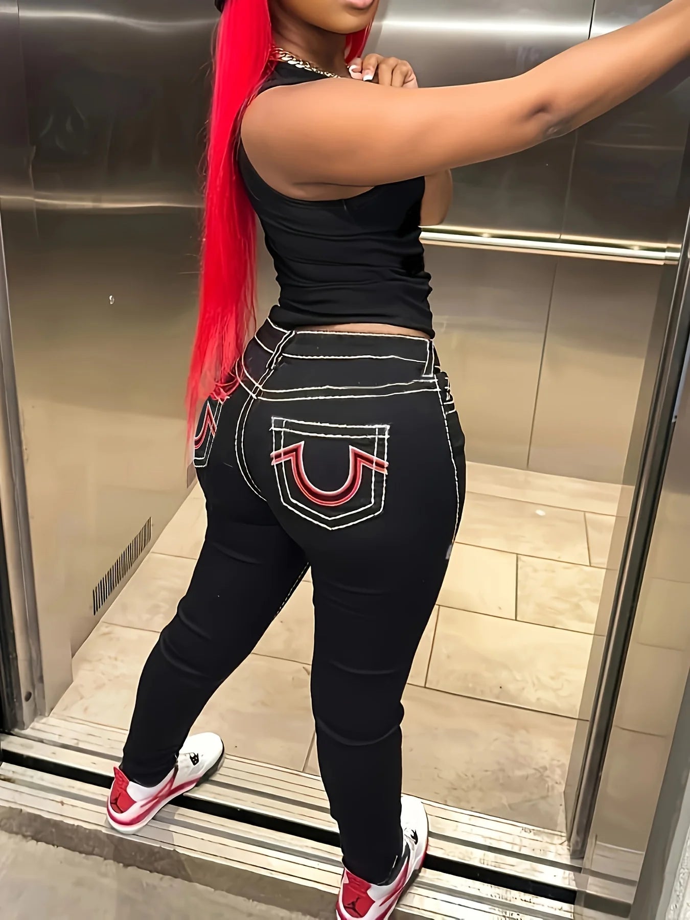 FZ Women's Elastic Embroidered Flared Slim-fit Mid-waist Denim Pants