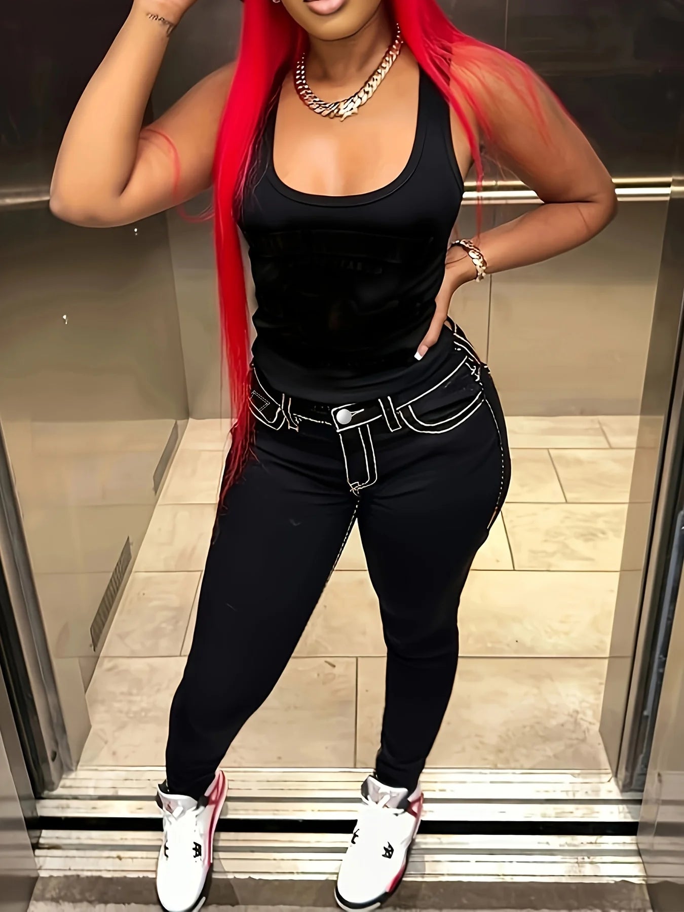 FZ Women's Plus Size Holes Pearls Vintage Cutout High Waist Denim Pants
