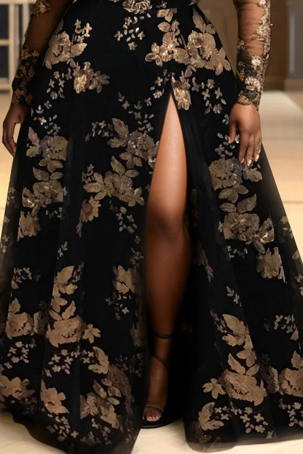 FZ Women's Plus Size V Neck Long Sleeve 3D Elegant Mermaid Sequin Maxi Dress