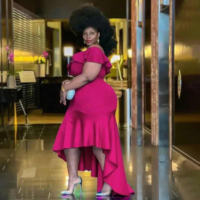 FZ Women's Plus Size Off The Shoulder Ruffle Contrast Satin Midi Evening Dress