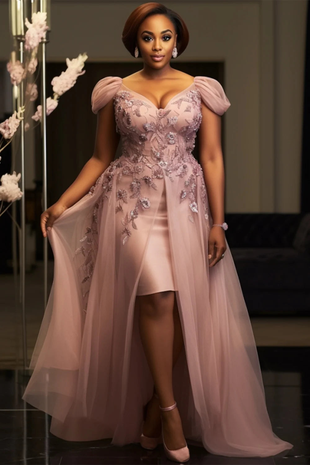 FZ Women's Pearl Sheer 3D Flower Package Hip High Slit Evening Dress