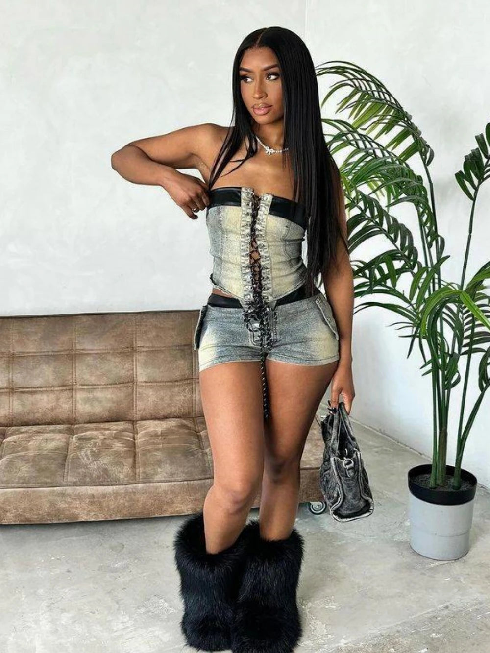 This cute and sexy Denim Shorts Suits features a strapless design and lace-up details, adding a touch of sultry charm to your outfit. Perfect for any occasion, this suit will keep you looking slim and stylish all season long.