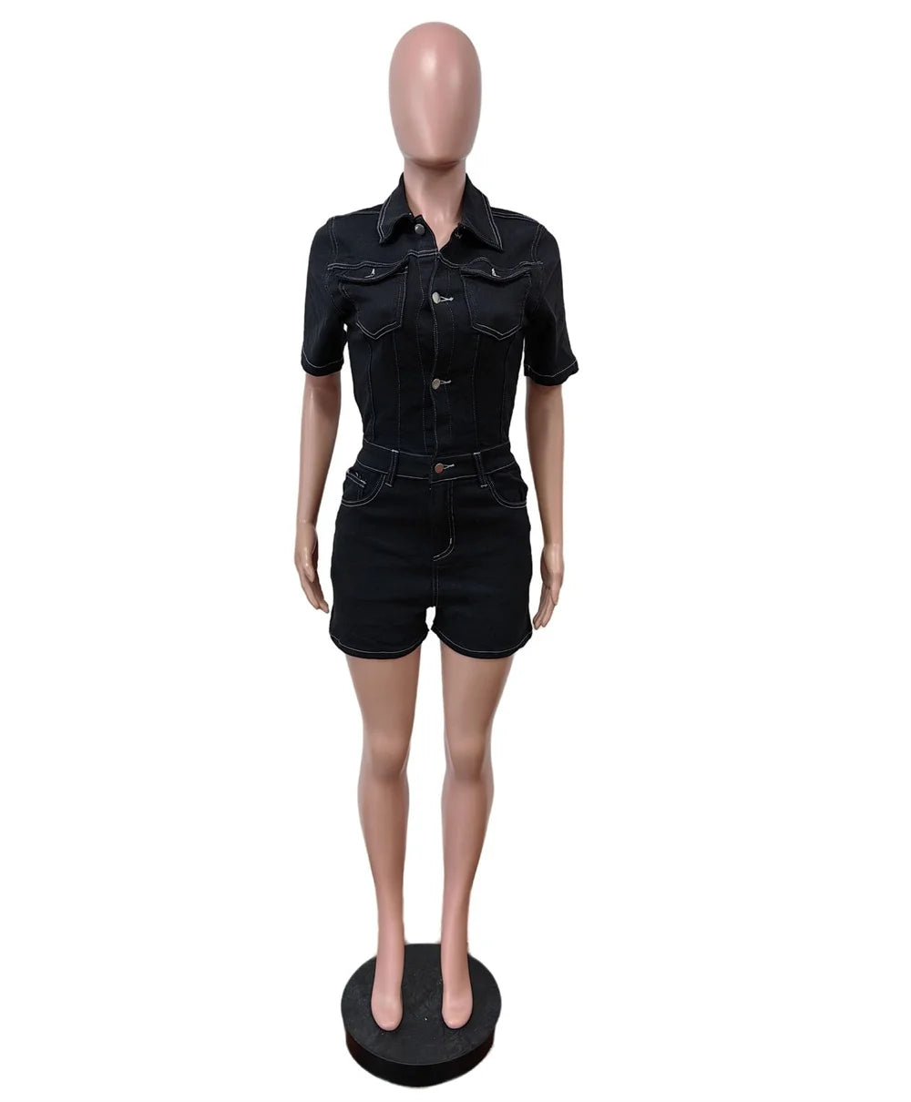 Benuynffy Summer Half Button Jumpsuit Romper Women 2024 Fashion Street style Short Sleeve Black Casual Stretch Denim Shorts FZwear