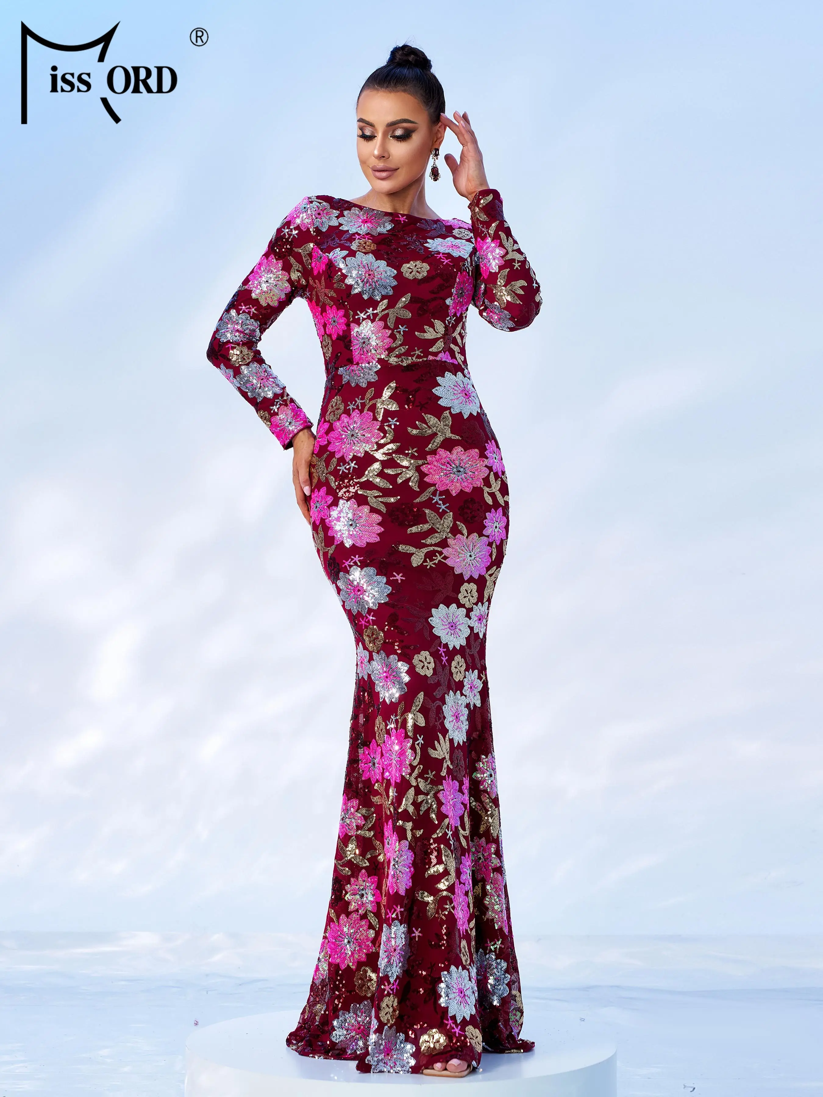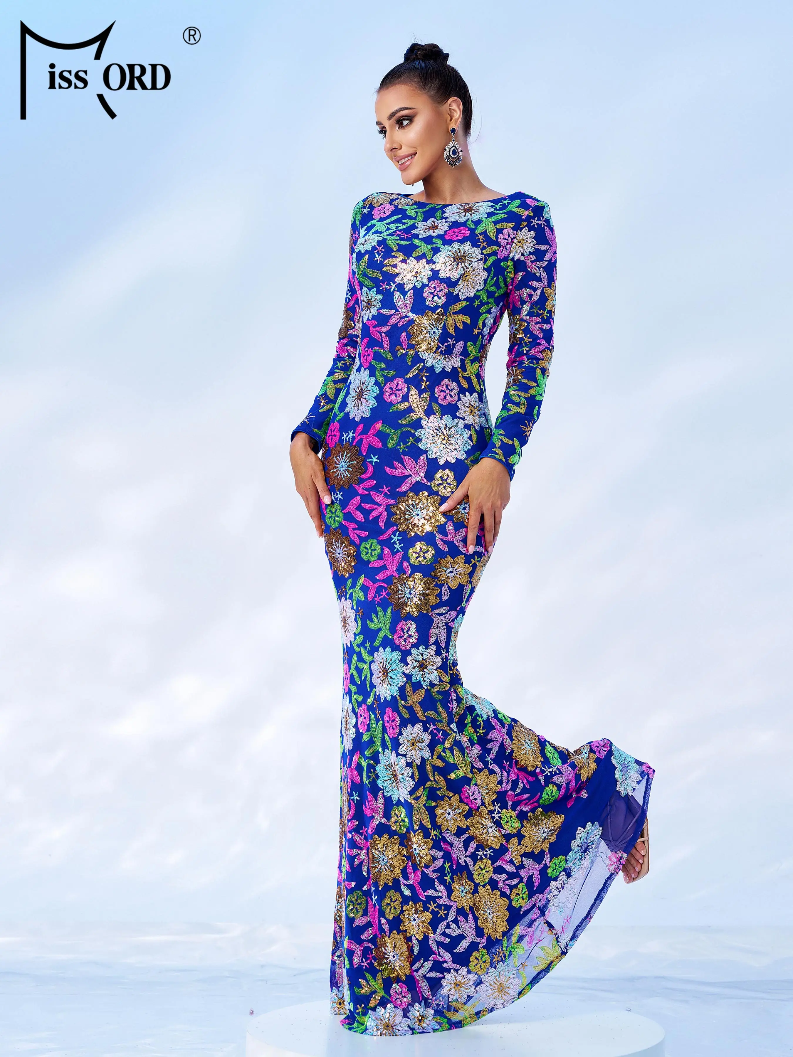 FZ Women's New Round Neck Floral Sequin Mermaid Cocktail Evening Dress