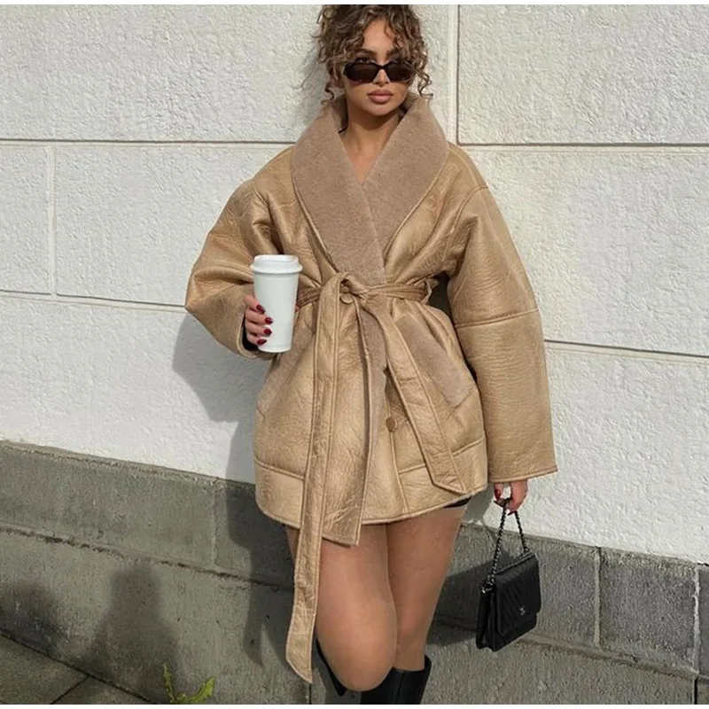 FZ Women'S Plush Single Breasted Turn-down Collar Belts Thick Leather Jacket