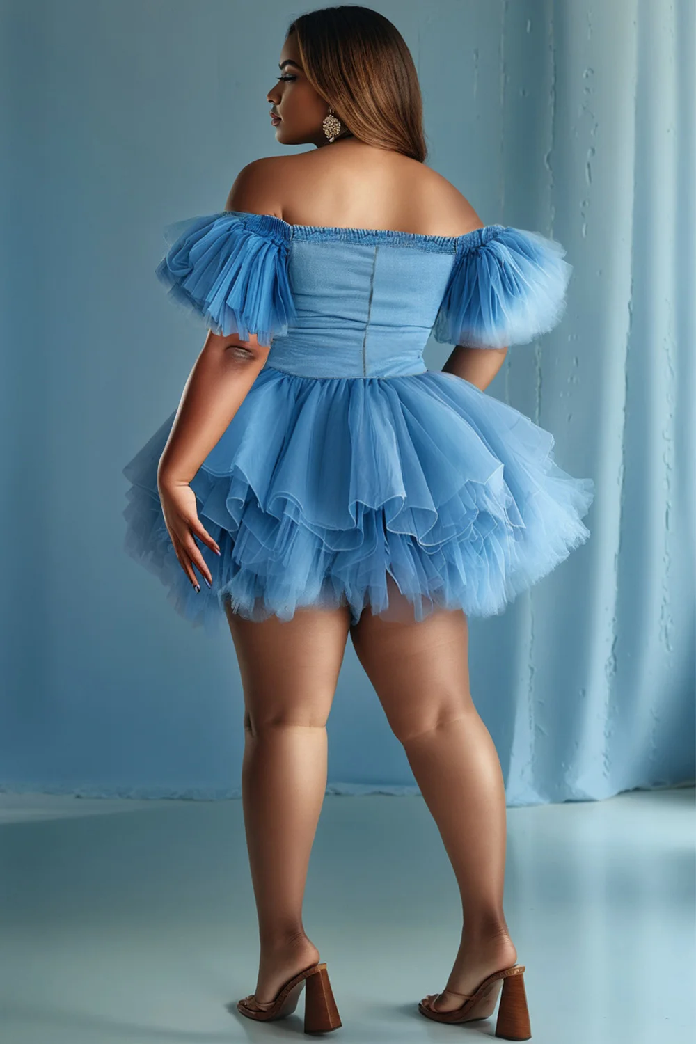 FZ Women's Plus Size Off The Shoulder Short Sleeve Pleated Contrast Mini Denim Dress