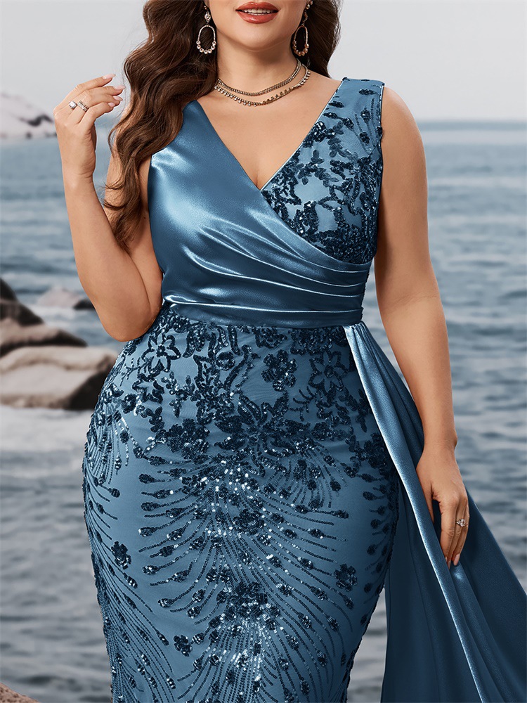 This elegant cocktail evening dress combines sophisticated sequin stitching with a flattering V-neck design, tailored to enhance plus-size figures.