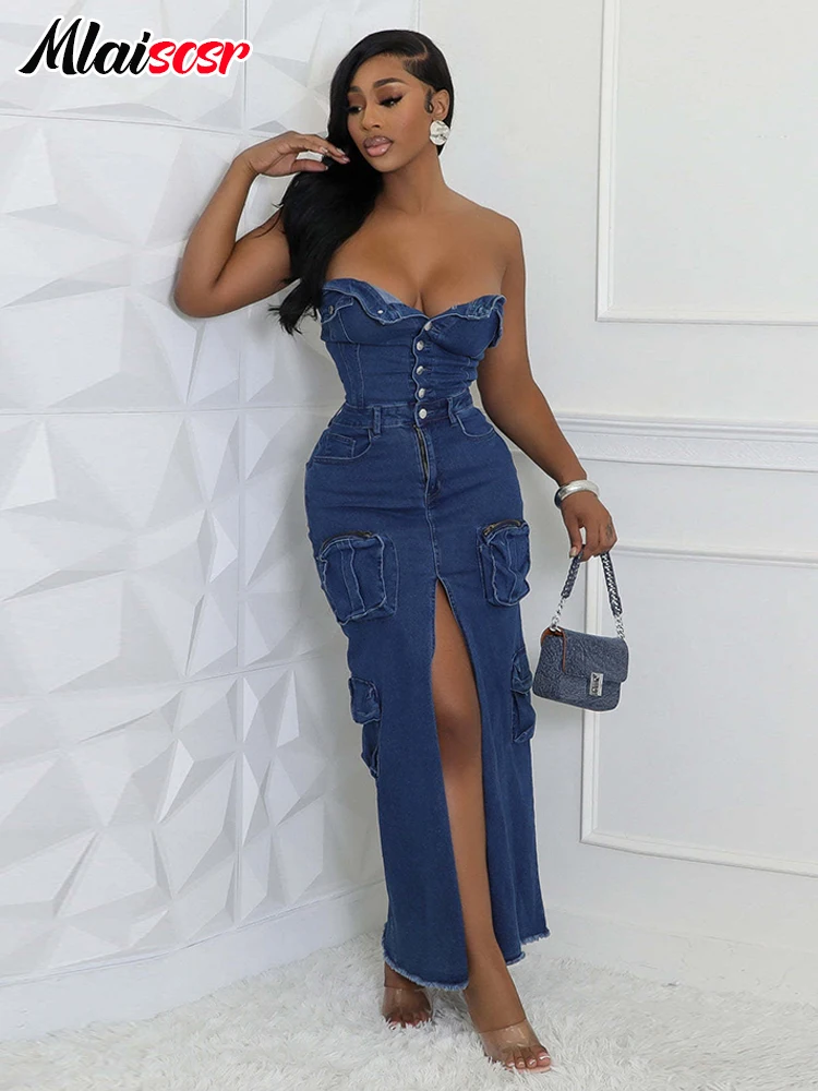 Elevate your style with the FZ Women's Off Shoulder Strapless High Spliced Denim Dress.