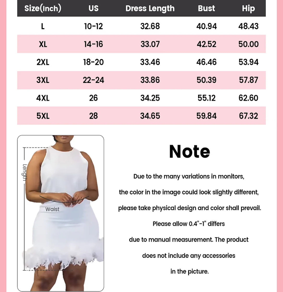 The plus size mini dress can create the illusion of a longer torso by visually elongating your legs. It comes with a slim fit, making it nicely hug your every curve in the right place. The fluffy feather adds a playful touch to the mini dress and gives it a whimsical vibe. For a formal look that's suitable for weddings, bridal showers, or cocktail parties, you can pair the mini dress with some accessories and heels while for a casual look for daily wear, simply wear it with flats.