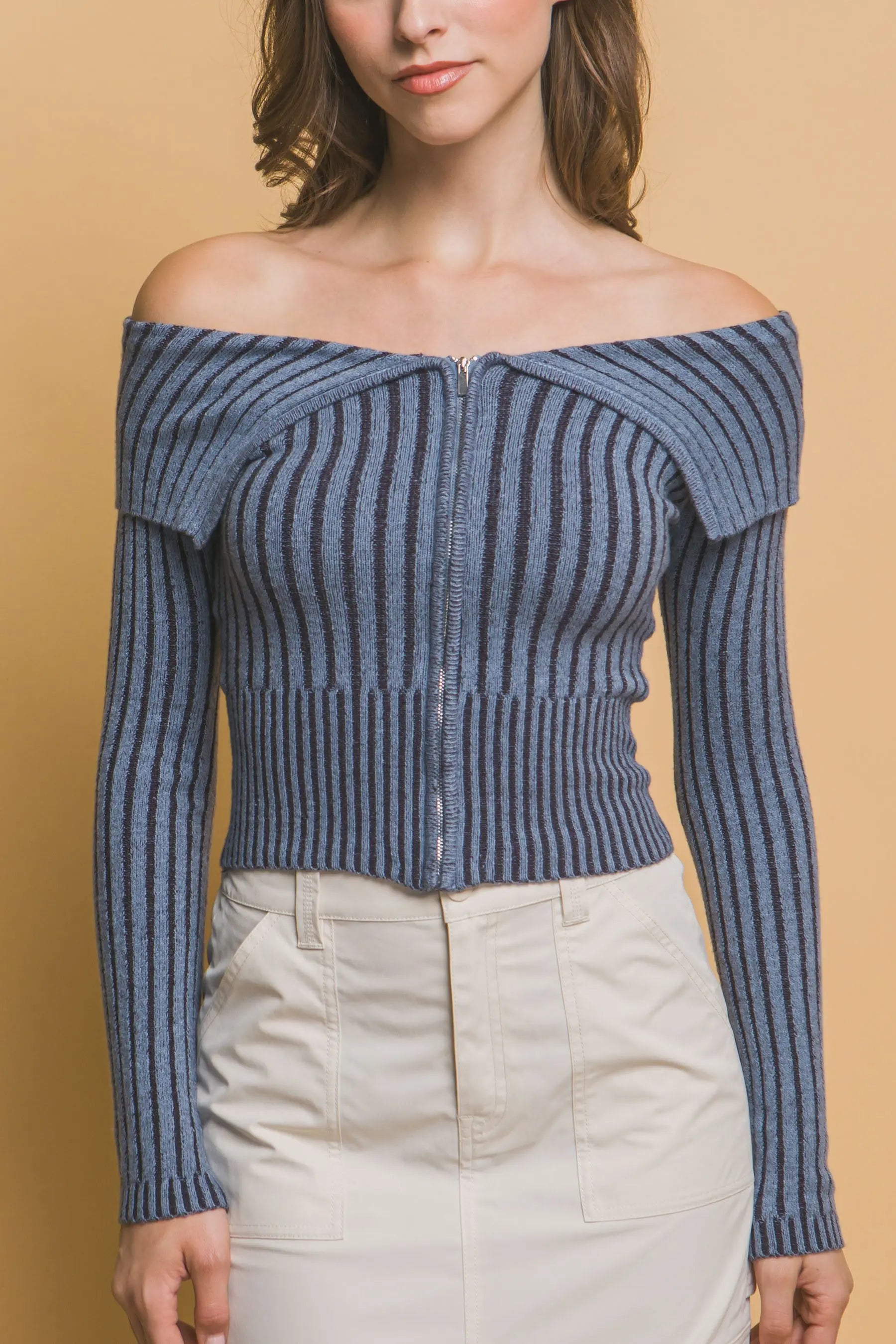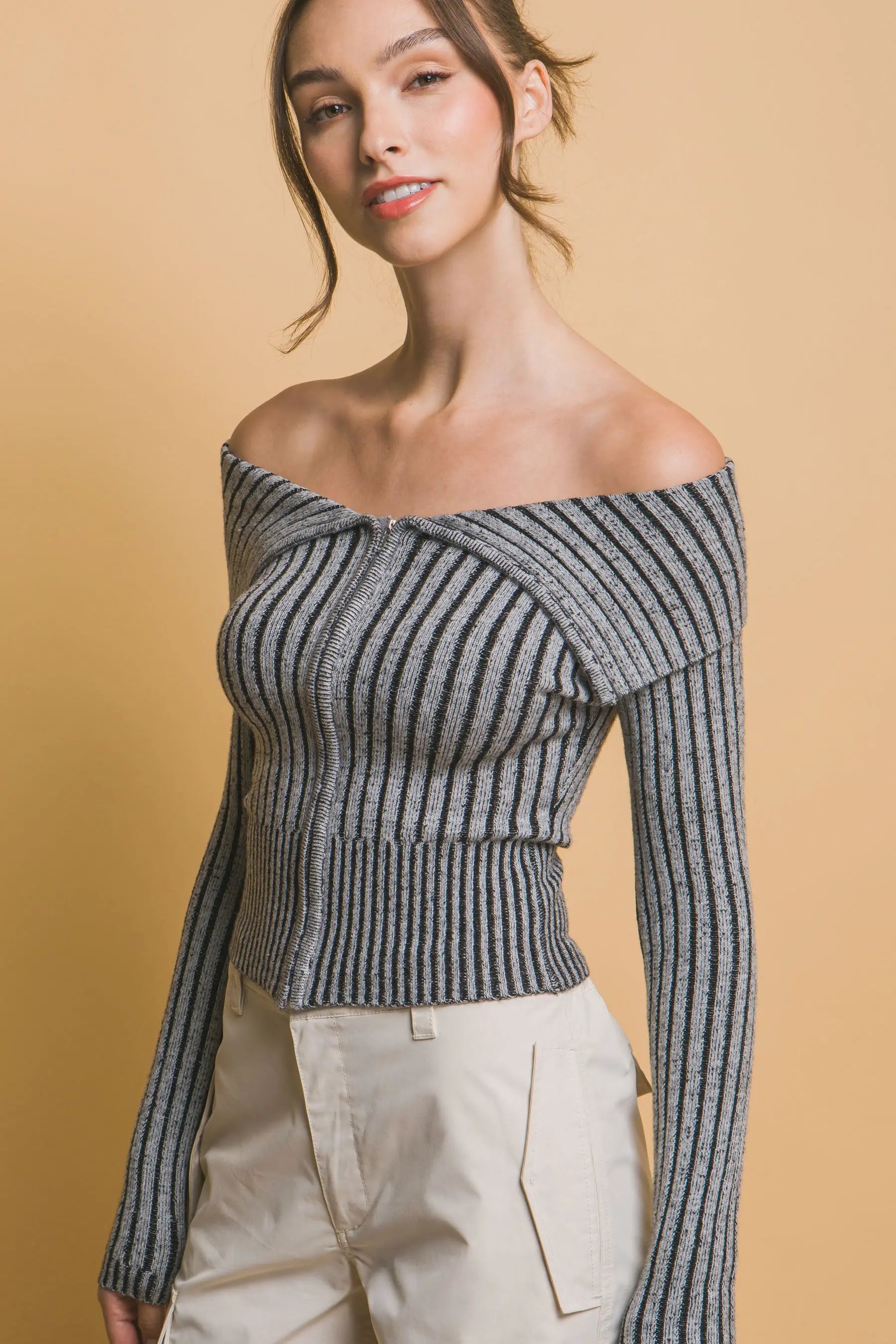 Ribbed bardot zip up long sleeve CCWHOLESALECLOTHING
