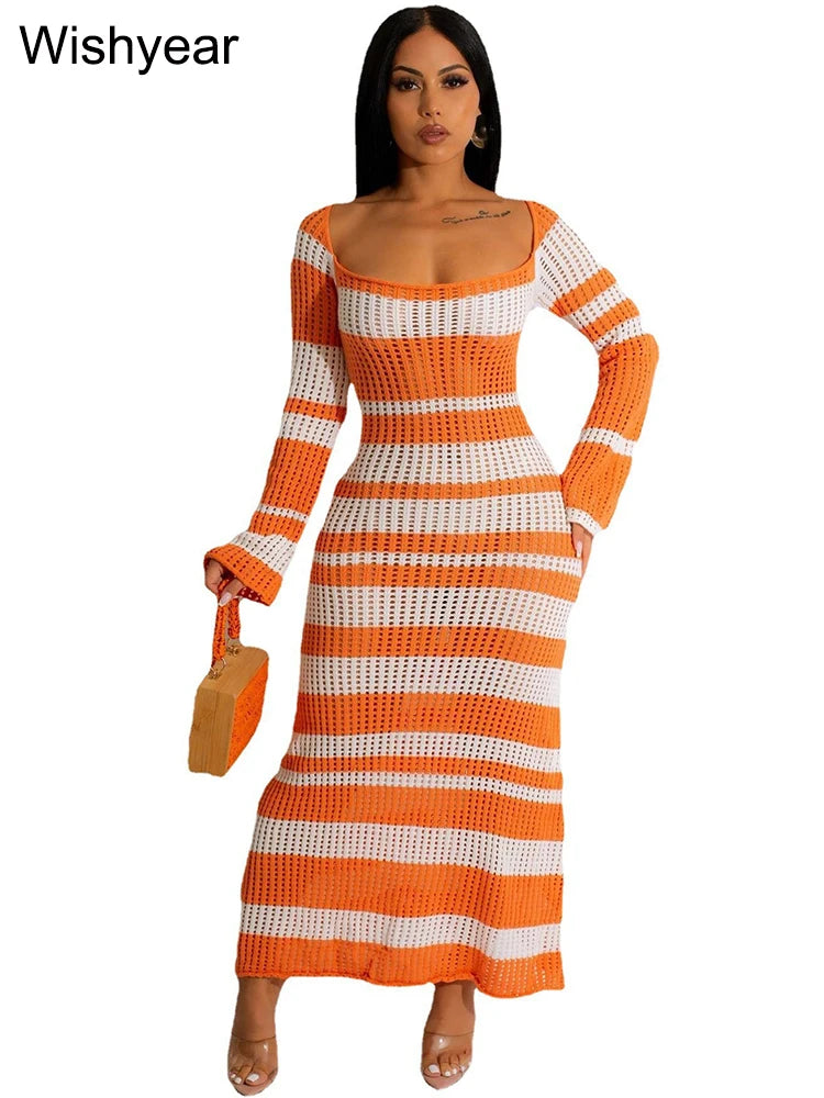 FZ Women's Sexy Elegant Striped Knitted Maxi Sun Dress