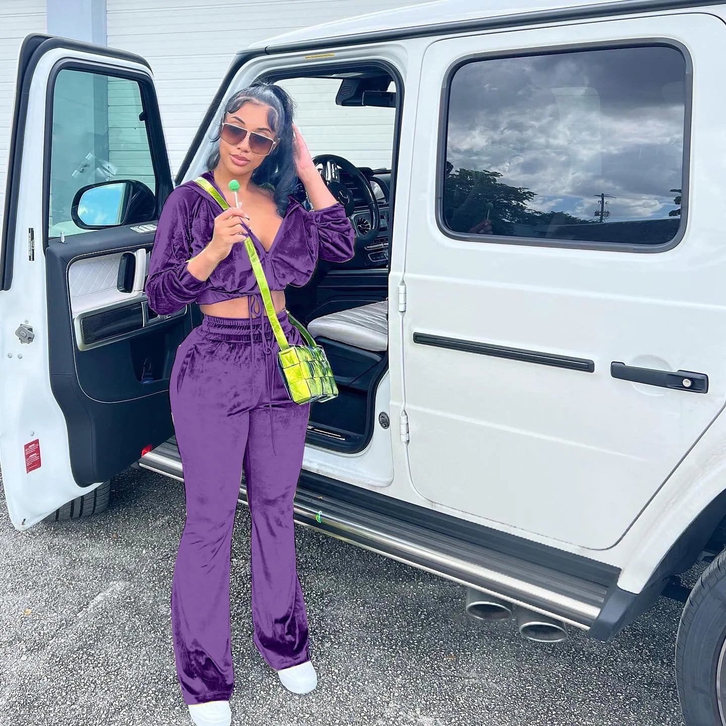 FZ Women's Long Sleeve Zipper Fly Hooded Two 2 Piece Velvet Flare Pants Suit