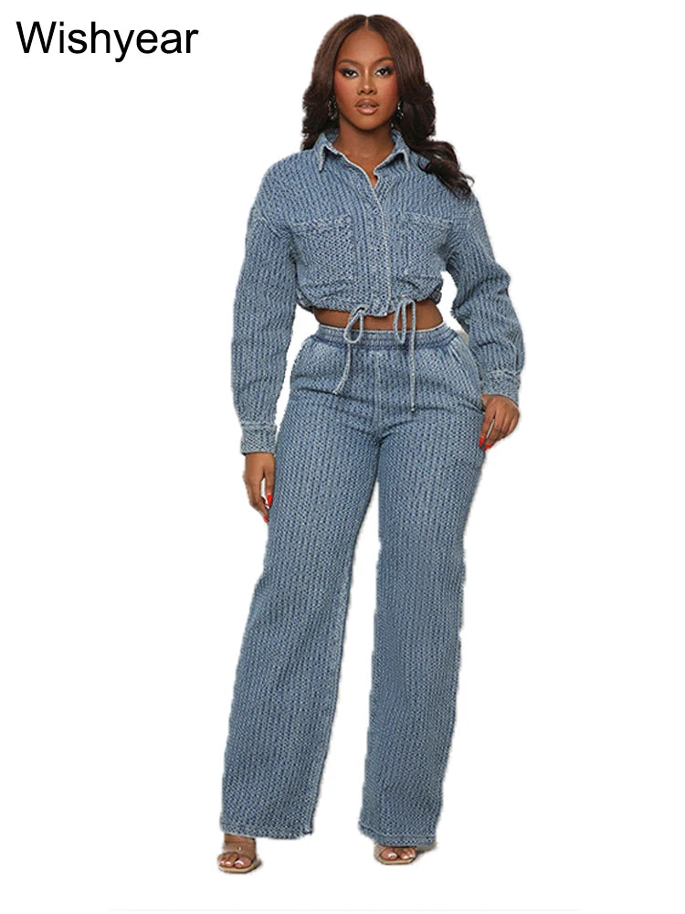 FZ Women's Elegant Denim Two Piece Drawstring Wide Leg Pants Suit - FZwear