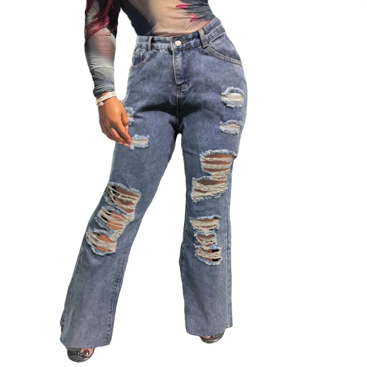 These FZ Women's Hole Straight High Waisted Button Pocket Streetwear Denim Pants are both sexy and cute, making them perfect for any occasion.