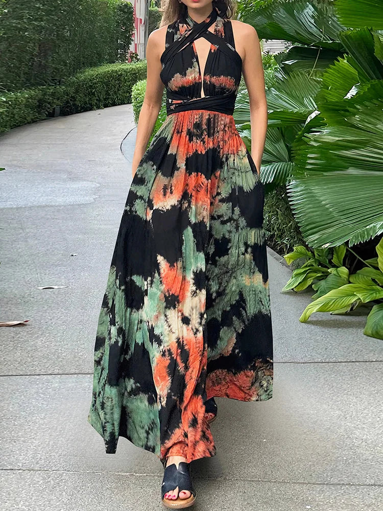 FZ Women's Hollow Sexy Patchwork Print Backless Slim Sundress