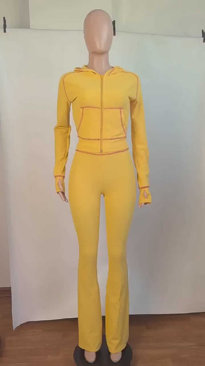 This two-piece pants suit features a long sleeve top with a hood and flare pants, perfect for a cute and sexy look. Made with quality materials, this suit will keep you feeling confident while you flaunt your curves.