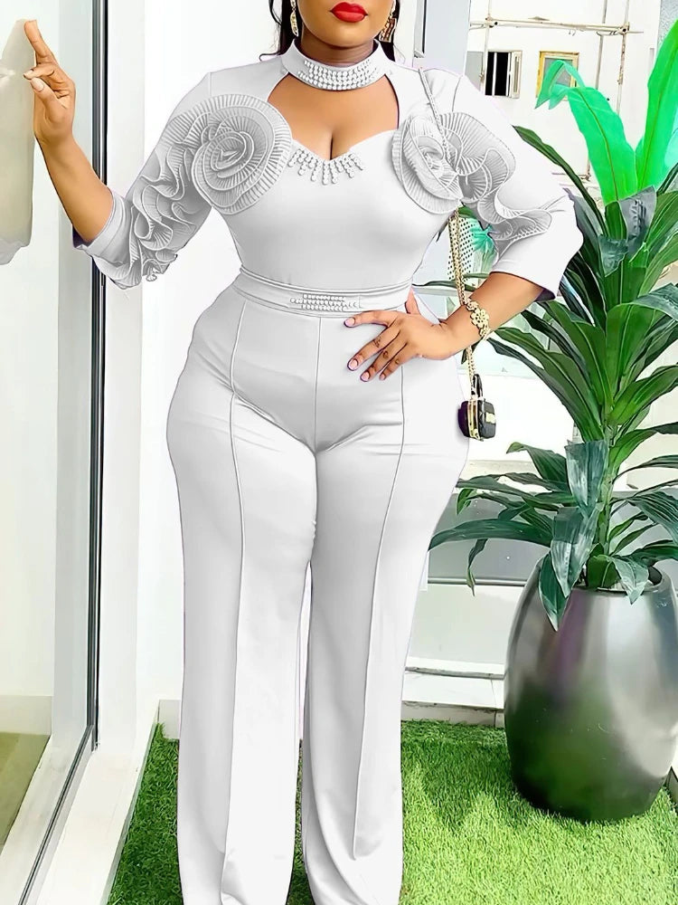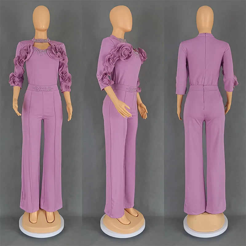 With its stylish and fashionable design, this pants suit is sure to make a statement. The high waist and wide leg pants provide a comfortable fit while the 3D flower and bead detailing add an extra touch of elegance. Elevate your wardrobe with this must-have piece.