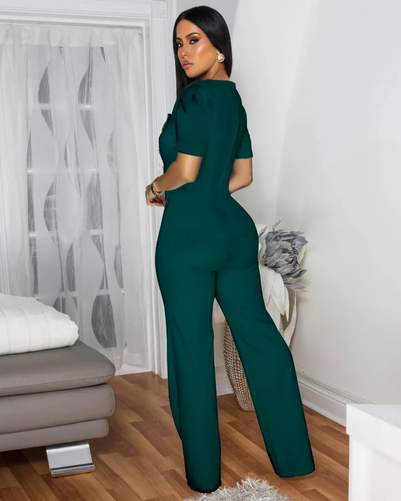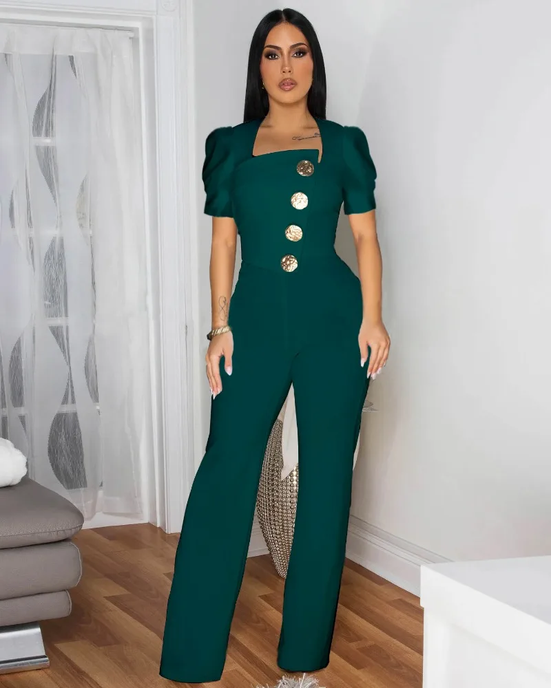 Featuring puffed short sleeves and a flattering button-front design, this jumpsuit offers a cute yet subtly sexy silhouette. The wide-leg cut ensures comfort and ease of movement, making it perfect for both casual outings and stylish events. Crafted to enhance your confidence, this jumpsuit is a versatile addition to any wardrobe.