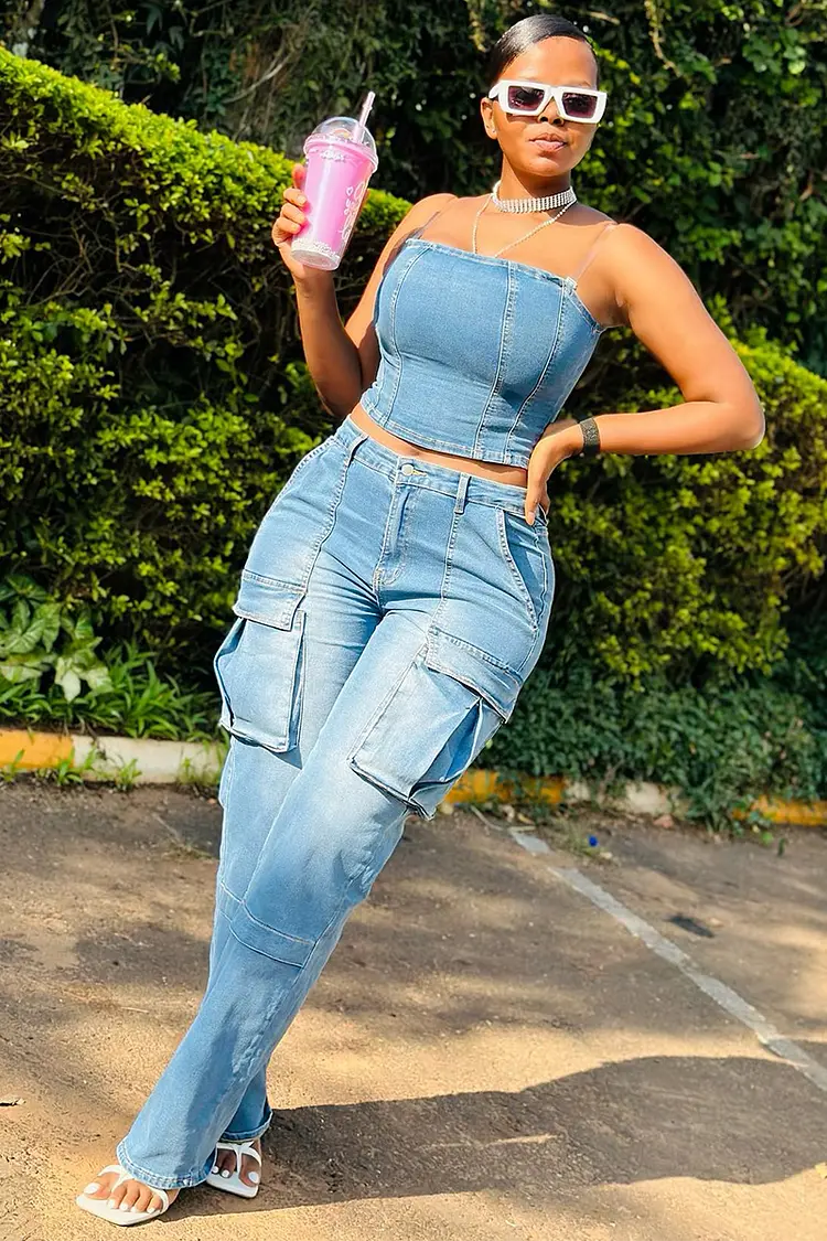 With a tube top and cargo pockets, this denim pants suit is stylish and functional. Made with high-quality denim, it provides comfort and durability.