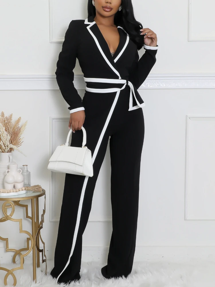 FZ Women's V Neck Turn Down Collar Long Sleeves Straight Jumpsuit