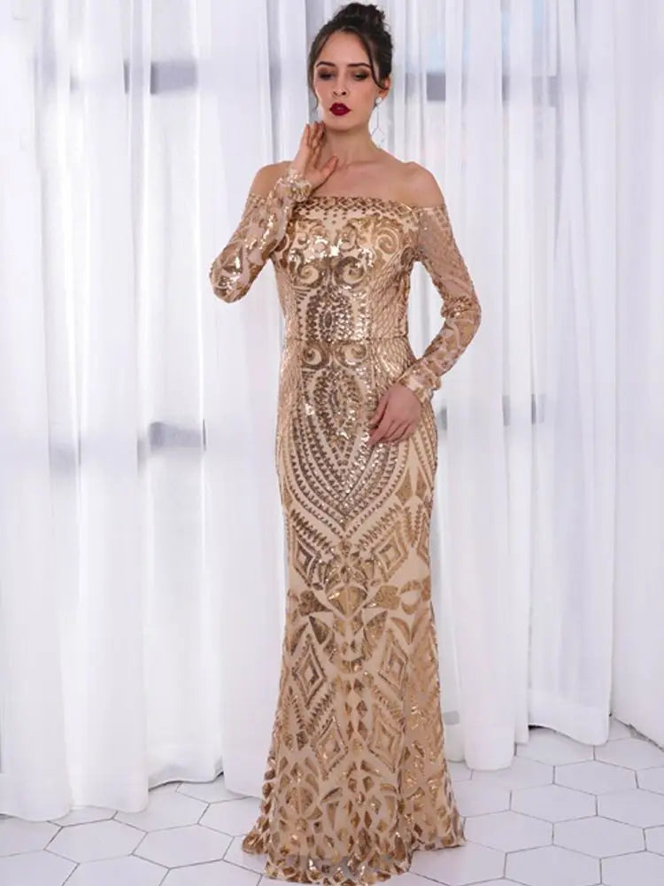 FZ Women's Sexy Off Shoulder Sequin Elegant Evening Maxi Dress