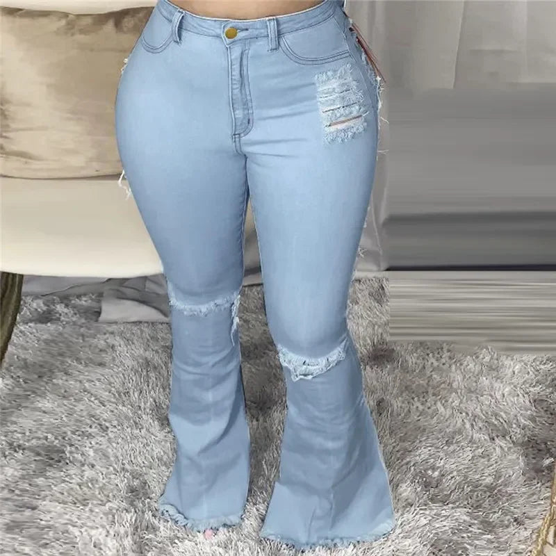 FZ Women's Hole Hollow Out Flared High Waisted Button Skinny Denim Pants