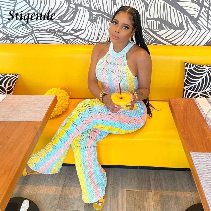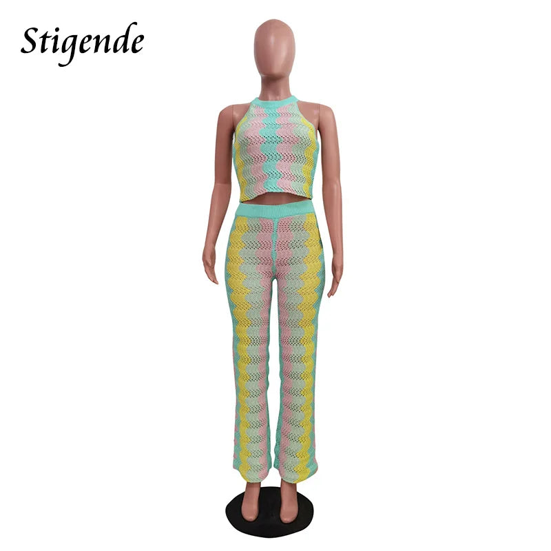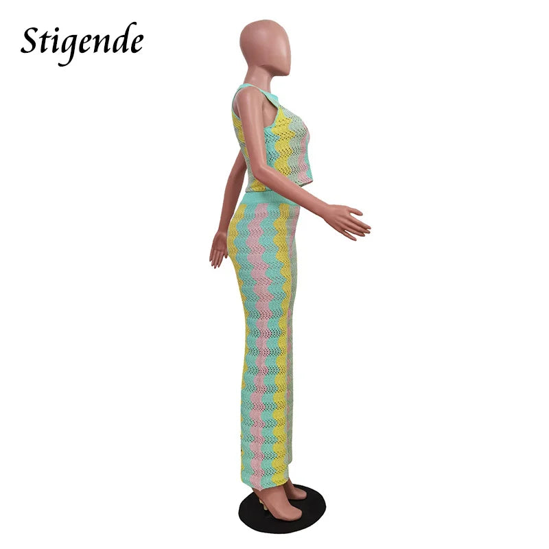 FZ Women's Striped Wave Knit Two Piece Hollow Out Swimsuit Cover up