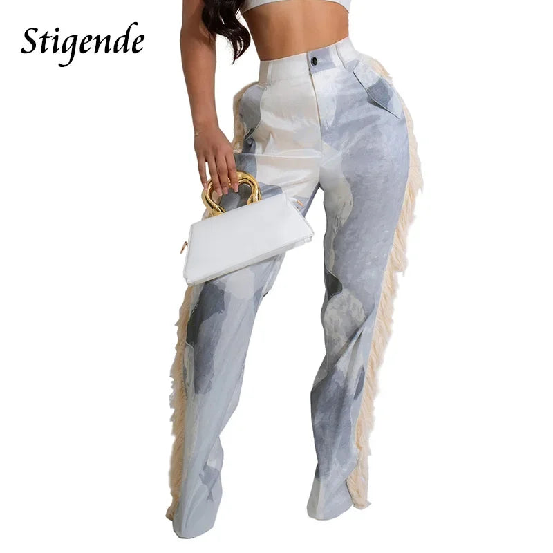 FZ Women's Patchwork Tassel Straight Print Pocket Wide Leg Pants