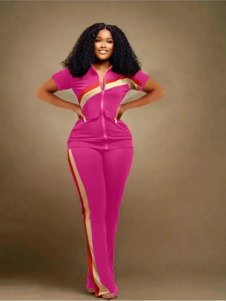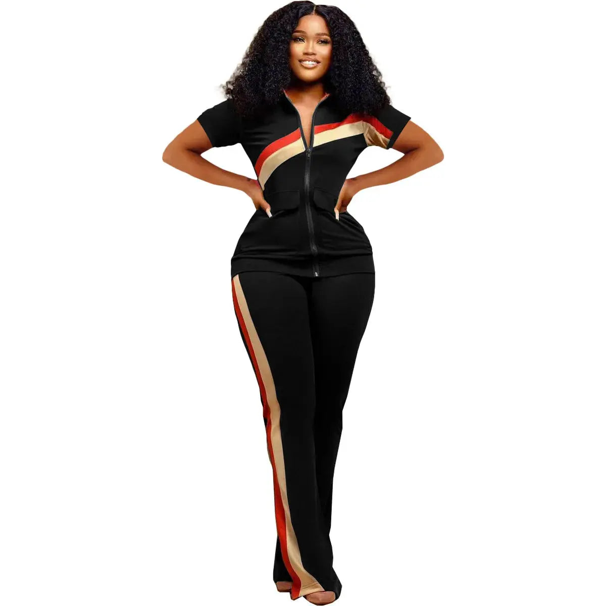 FZ Women's Sports Leisure V-neck Zipper Short Sleeve Stripe Print Pant Suit