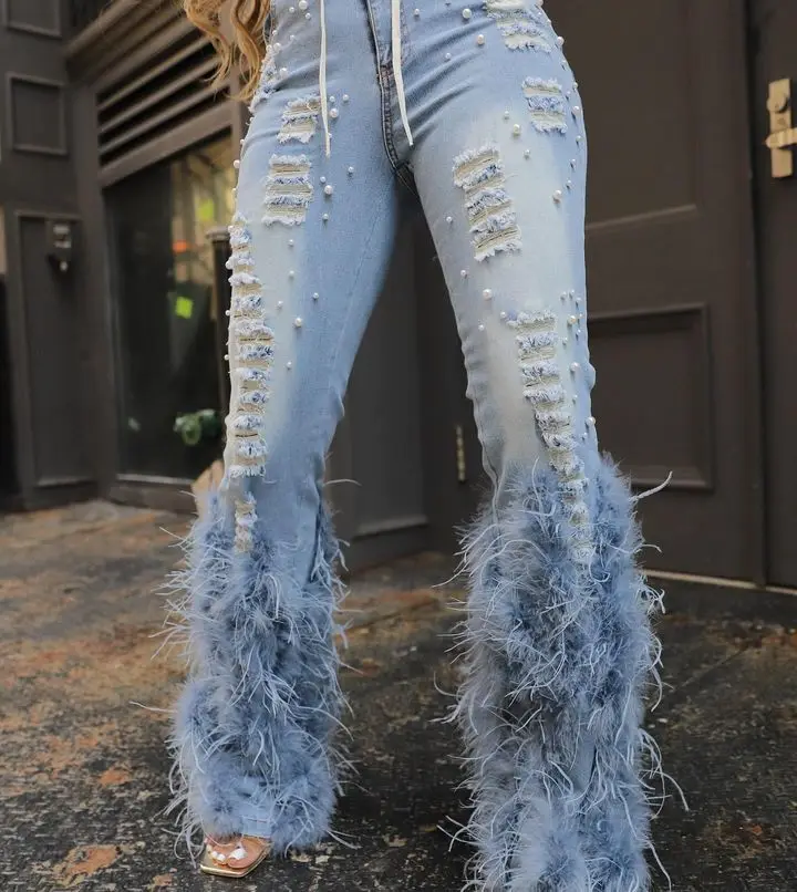 Elevate your style game with FZ Women's Feathers Beading Ripped Hole Denim Pants.