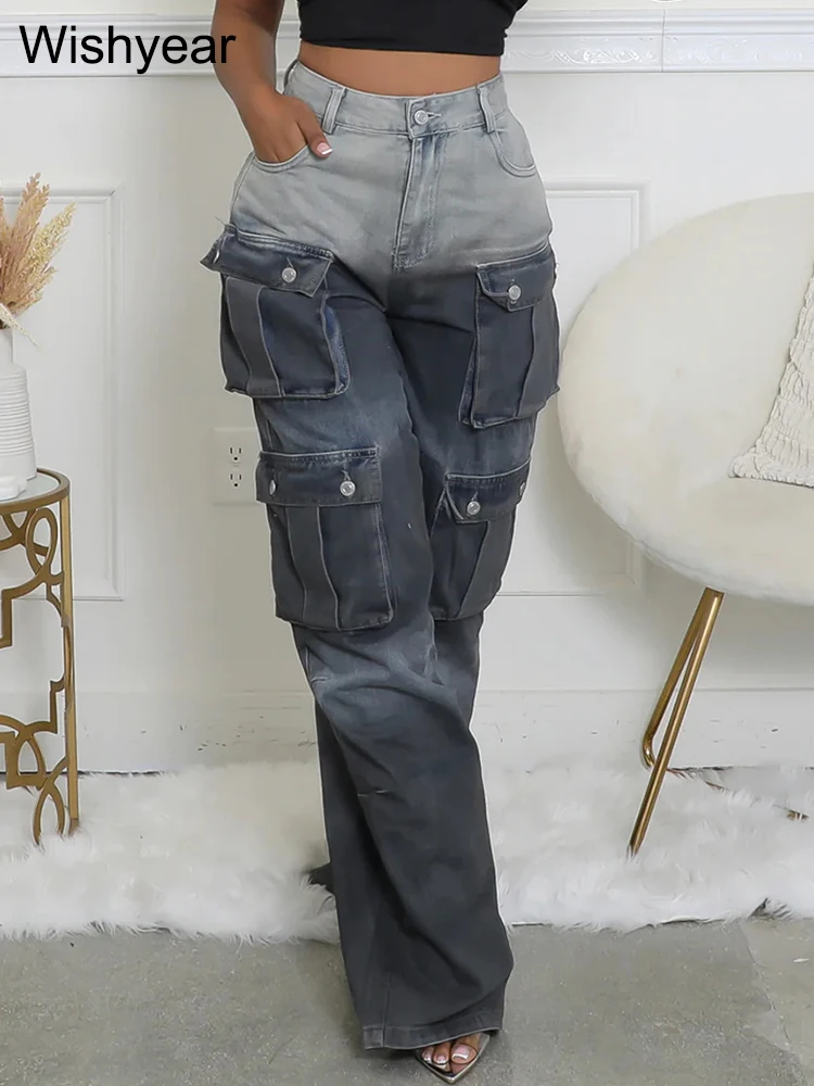 Introducing the FZ Women's Gradient Wide Leg Cargo High Waist Multi Pockets Denim Pants, a stylish and fashionable addition to your wardrobe.