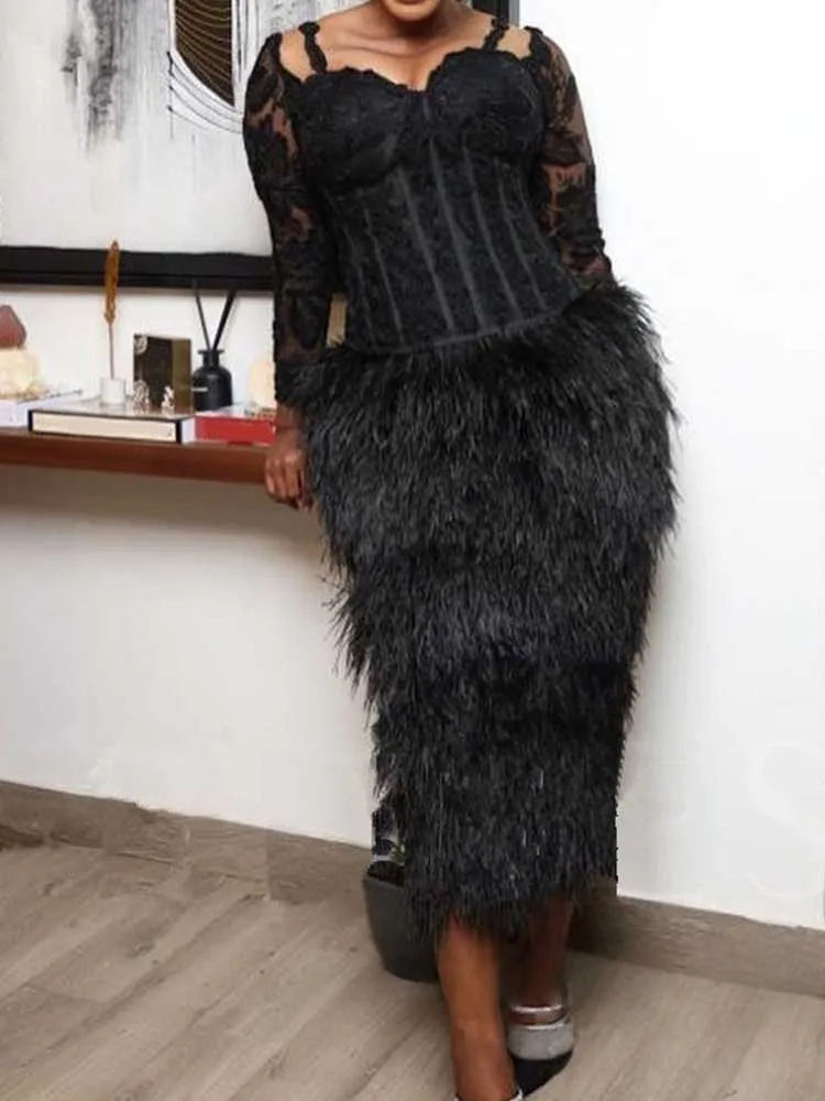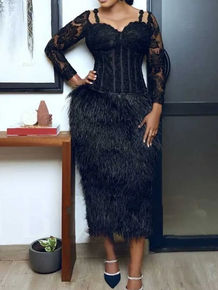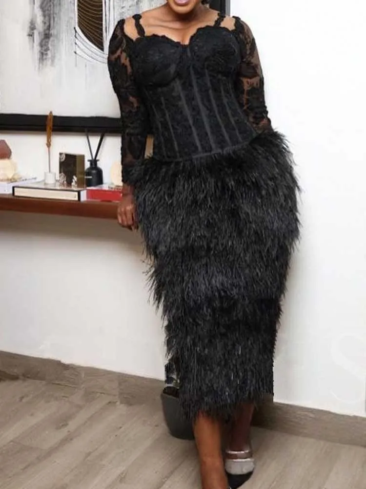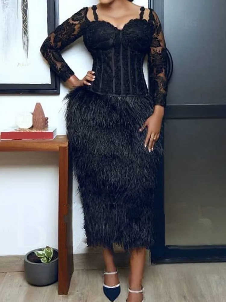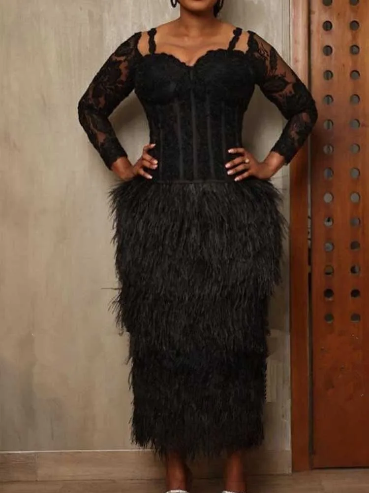 The strapless silhouette of this tassels dress offers a sophisticated neckline, while delicate lace sleeves add texture and visual interest. Decorative tassels provide an artful finishing touch that elevates the overall aesthetic. This versatile piece transitions seamlessly from evening events to upscale occasions, delivering polished style with modern flair.