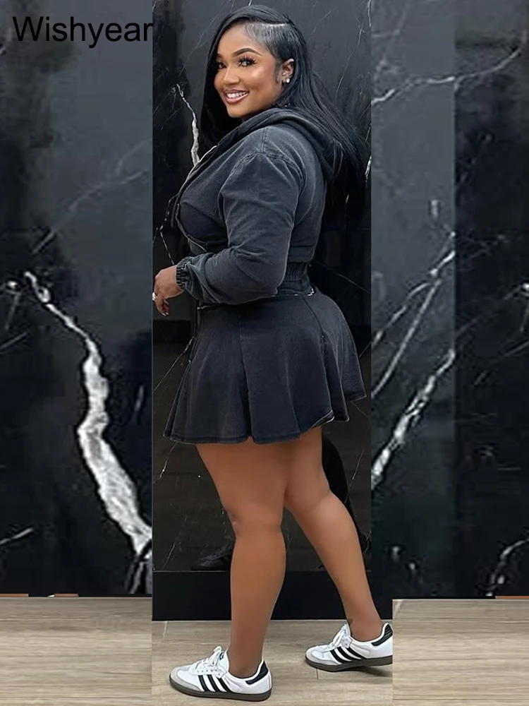 Elevate your wardrobe with the FZ Women's Long Sleeve Hooded Pleated Vintage Wash 2 Piece Denim Skirt Suit.