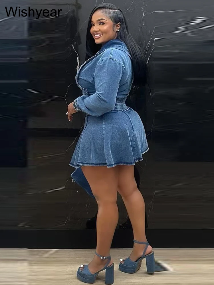 This expertly crafted denim skirt suit combines edgy vintage wash denim with modern tailoring, featuring a hooded long sleeve top that adds a casual yet alluring touch. The pleated skirt enhances feminine appeal while offering comfortable movement. Perfect for making a bold, sexy statement with style and sophistication.