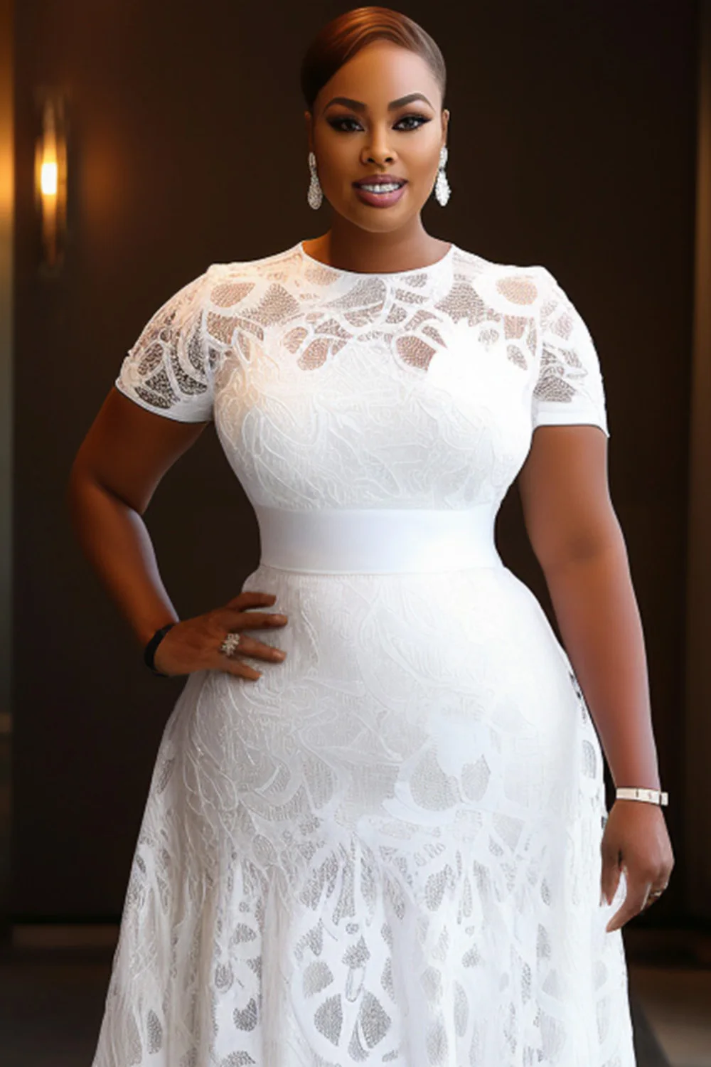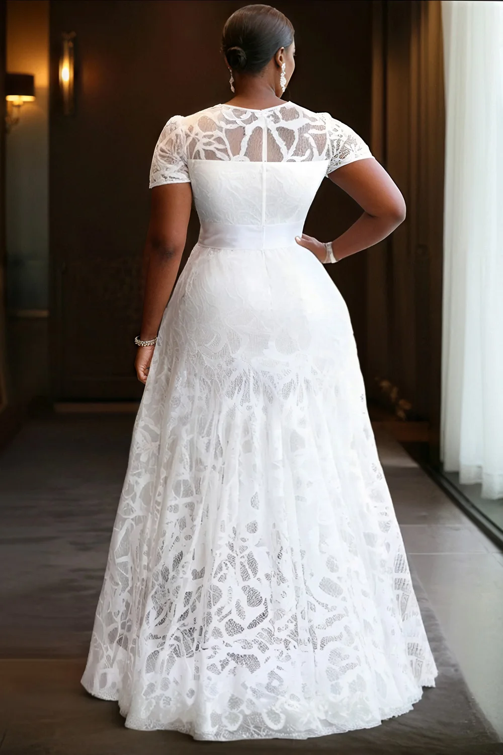 This FZ Women's Plus Size Round Neck Short Sleeve Lace Maxi Dress combines elegance with modern style.