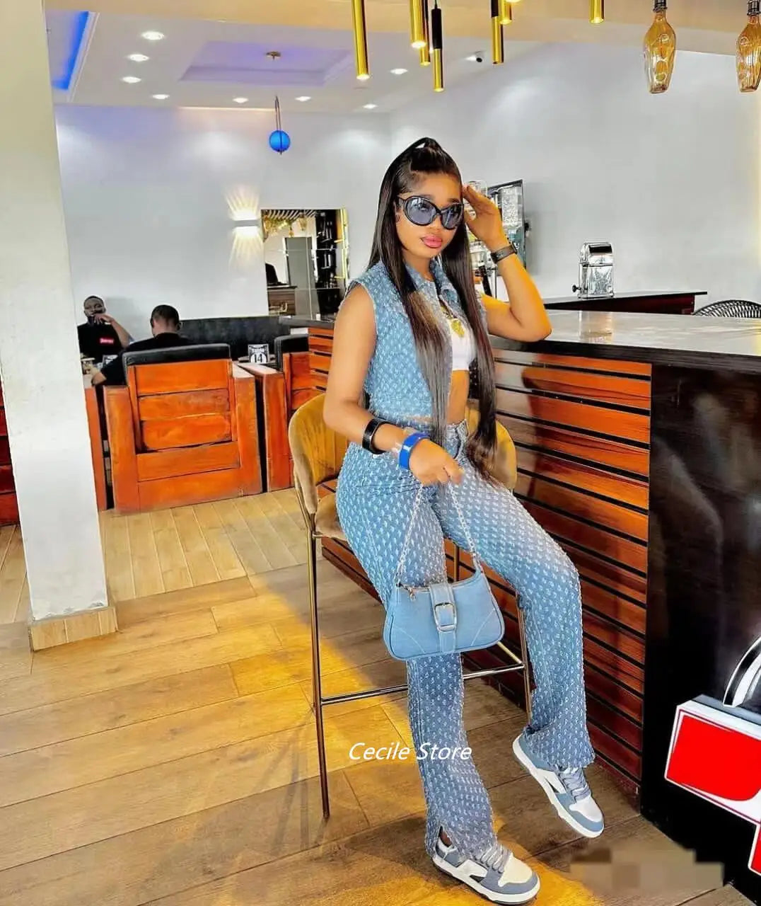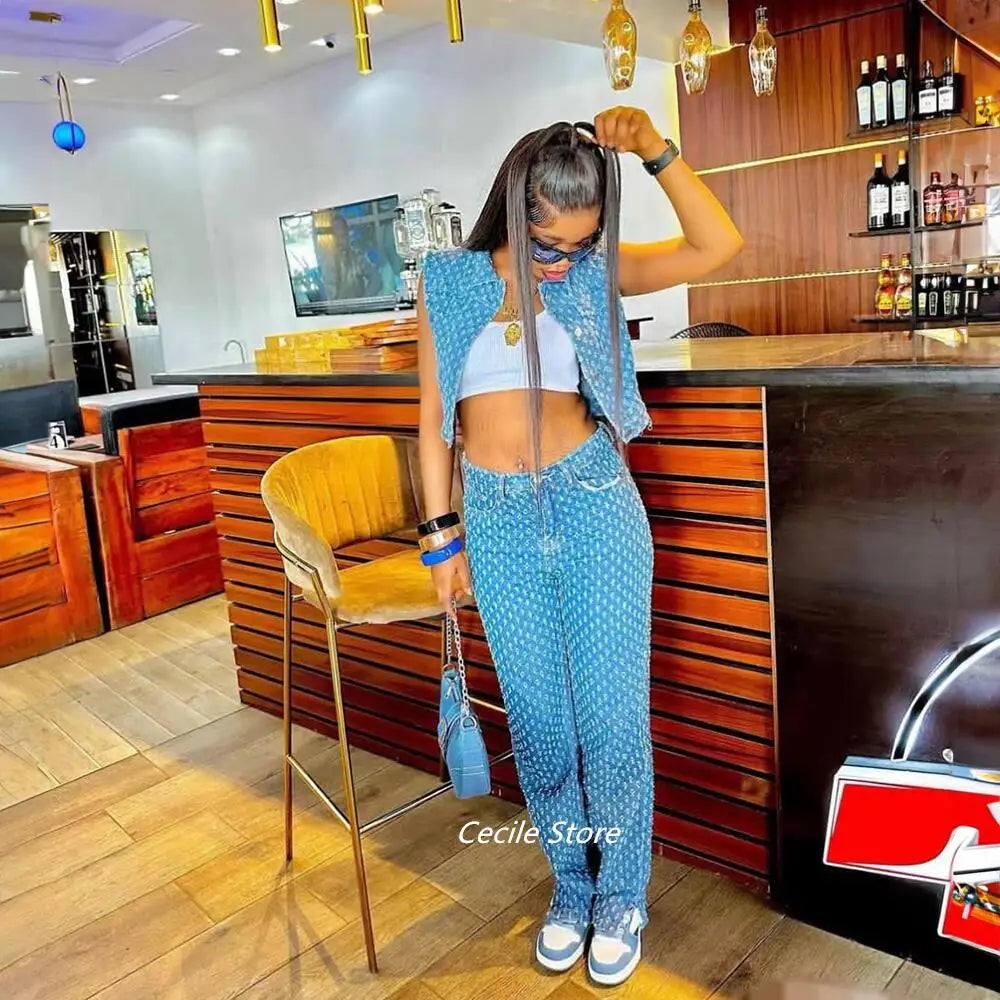 FZ Women's African Ripped Three-piece Wide Leg Slit Denim Pants Suit