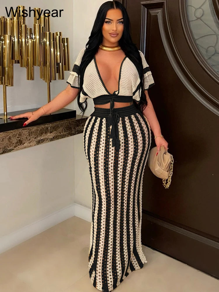 FZ Women's Striped Wave Knit Two Piece Hollow Out Swimsuit Cover up
