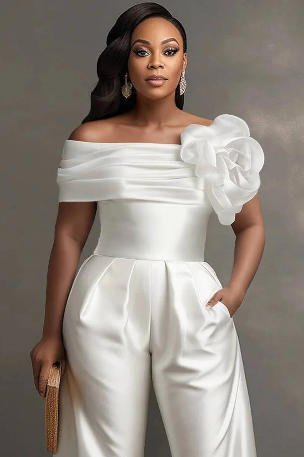 Elevate your wardrobe with the FZ Women's Plus Size Off The Shoulder 3D Pocket Satin Jumpsuit.