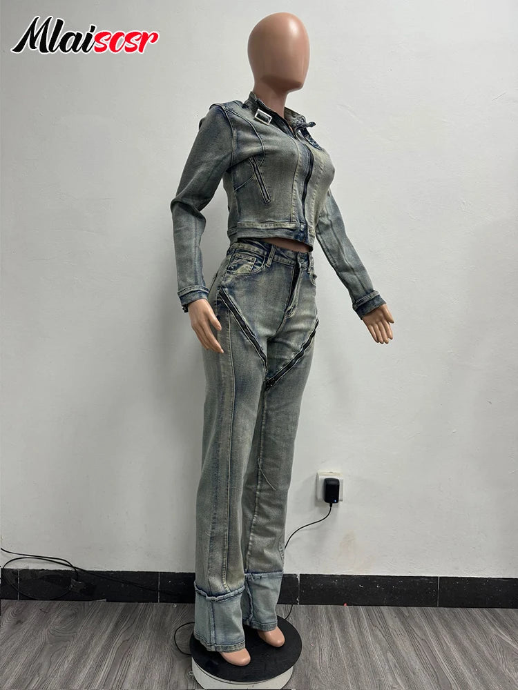 FZ Women's Stretch Straight Cargo High Street Two Pieces Denim Pants Suit