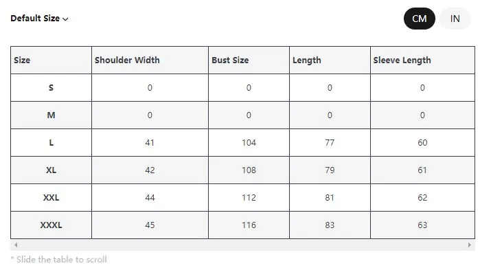 | Size | US Size | Shoulder Width | Bust Size | Length | Sleeve Length |