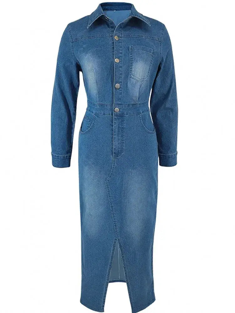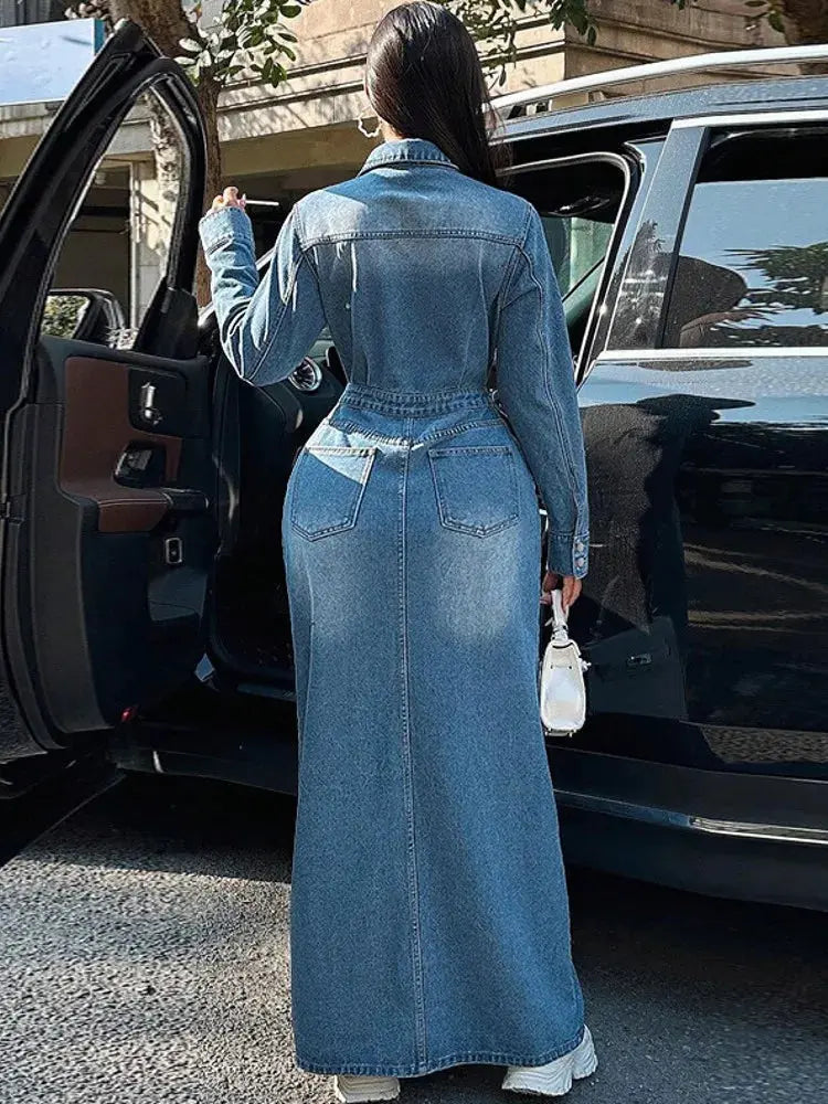 Elevate your style with the FZ Women's Maxi Shirt Neck Temperament Single Breasted Denim Dress.
