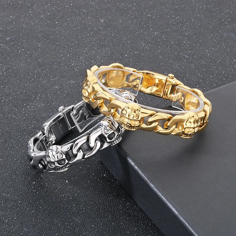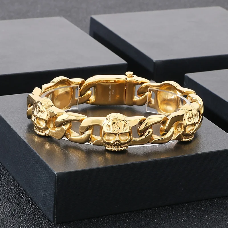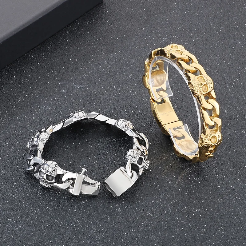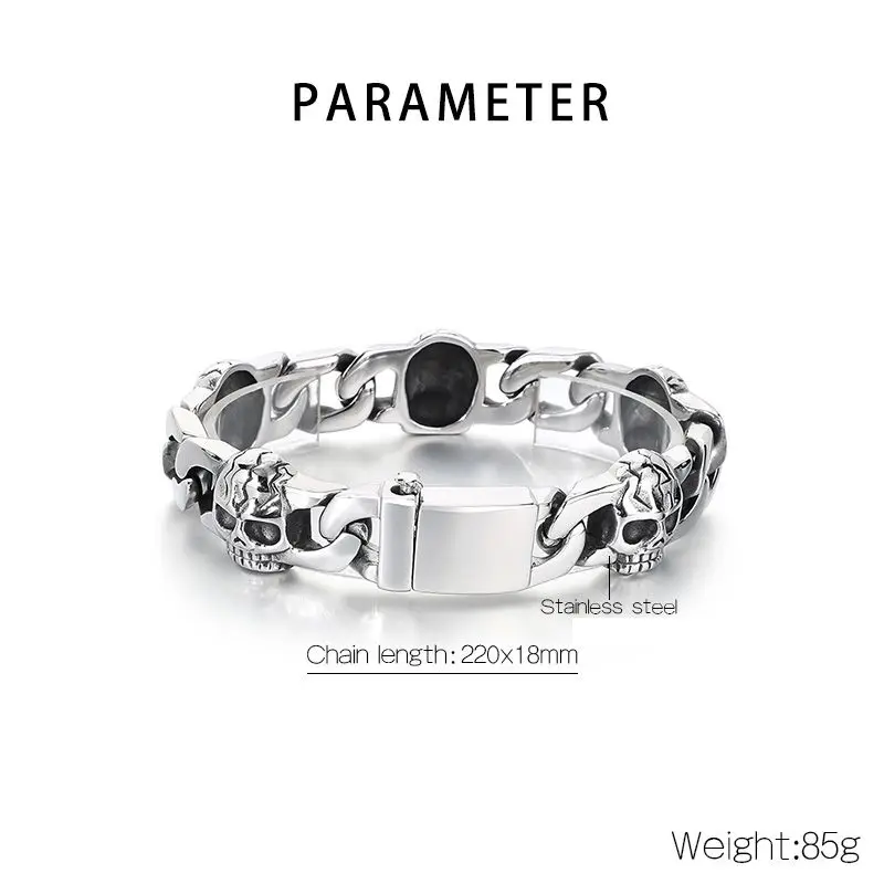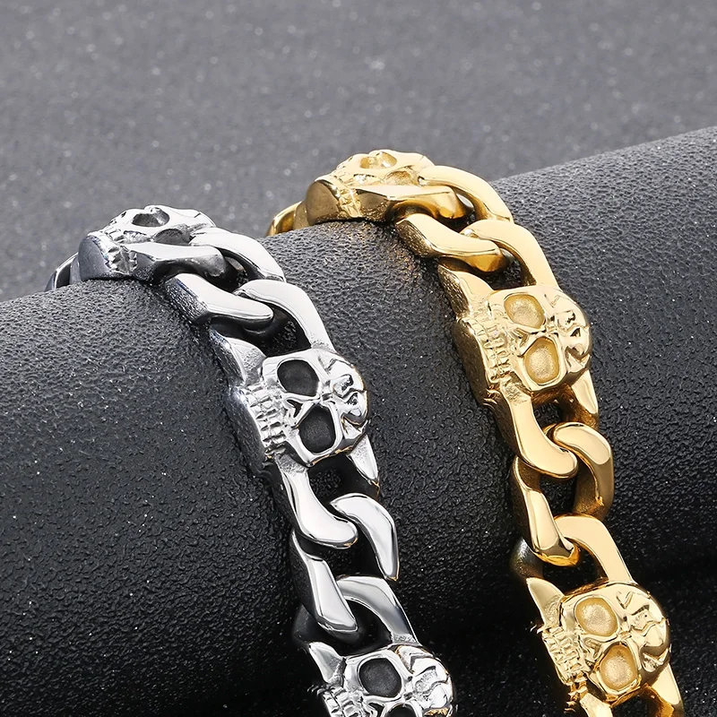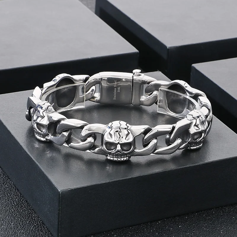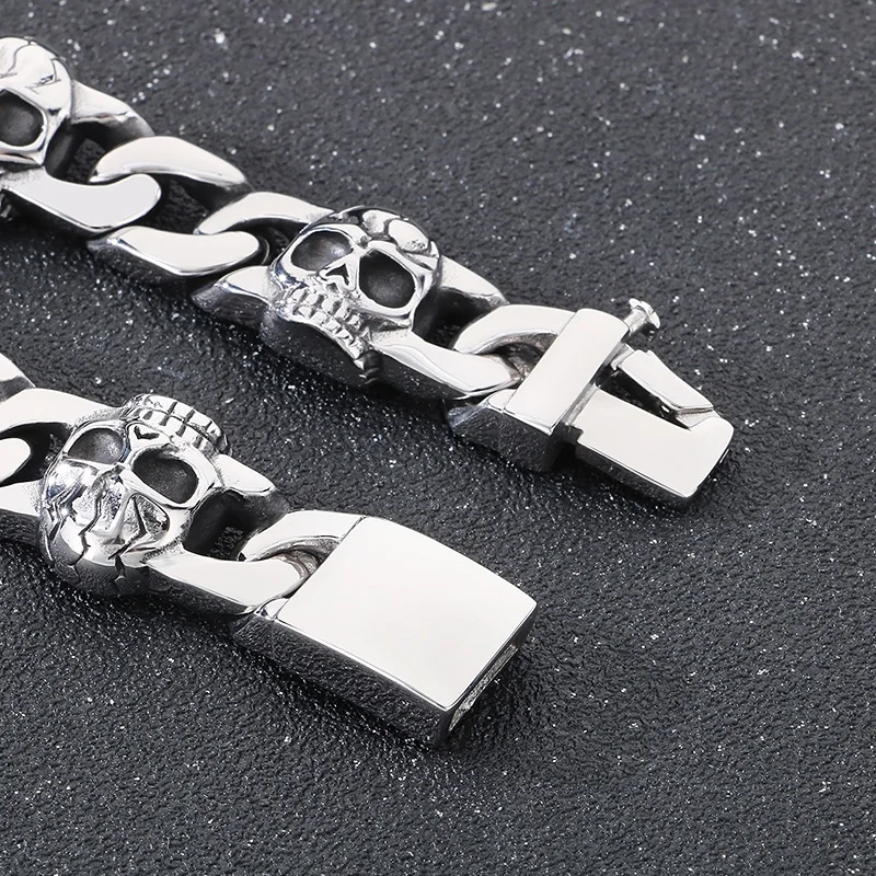 FZ Single Row Cracked Skull Head Stainless Steel Bracelet combines bold aesthetic appeal with lasting durability.