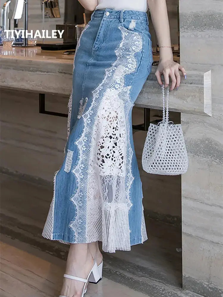 FZ Women Mermaid Style High Waist Maxi Fishtail Lace and Denim Skirt