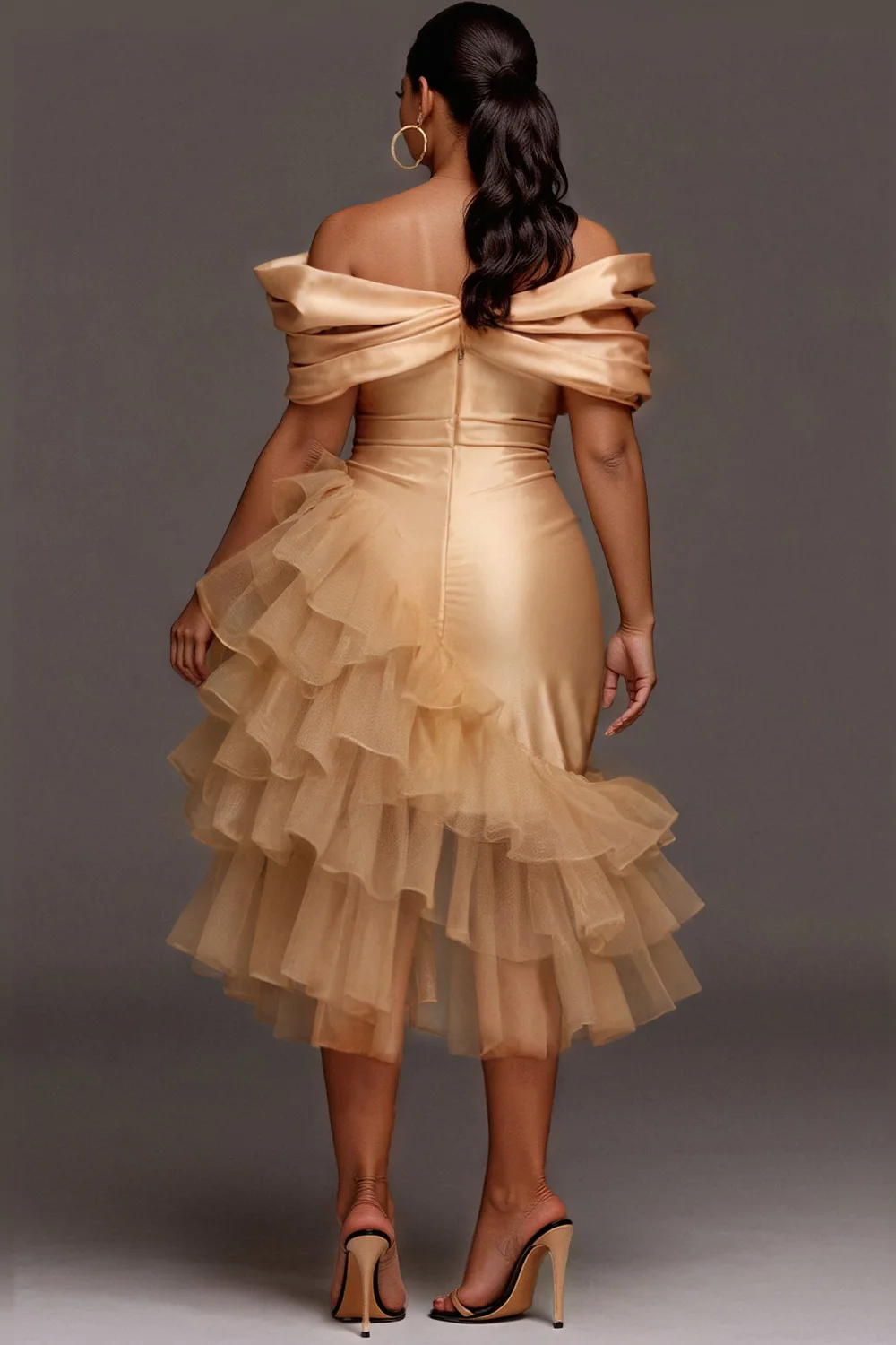FZ Women's Plus Size Off The Shoulder Ruffle Contrast Satin Midi Evening Dress