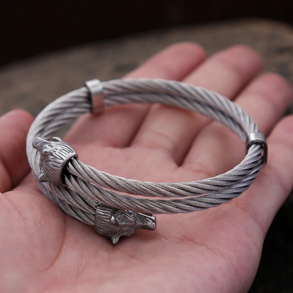 Crafted from stainless steel, this vintage bracelet striking double wolf head design symbolizes strength and loyalty, making it a distinctive accessory that elevates any outfit. Perfect for those who appreciate bold, timeless fashion statements with a nod to Norse heritage.