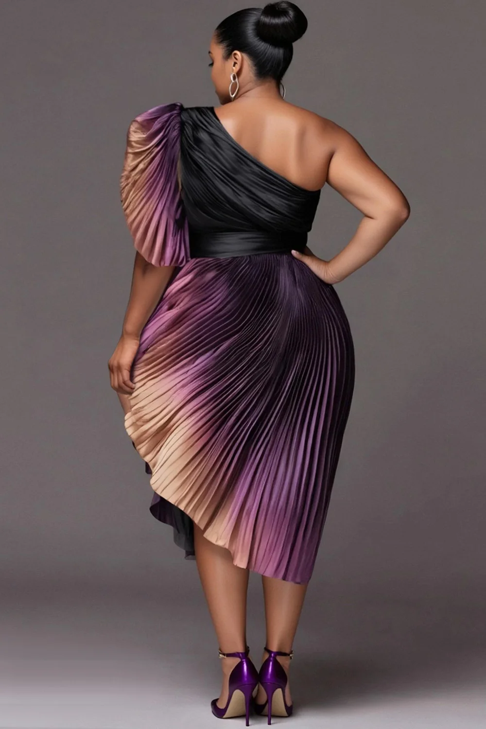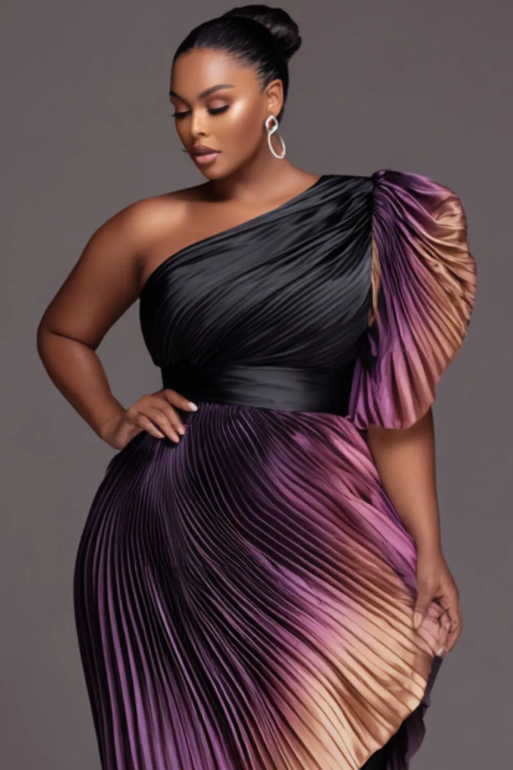 The striking one-shoulder silhouette of this midi dress creates an effortlessly chic look, while the pleated details and asymmetric hem add dynamic movement and visual interest. Crafted in plus sizes, this piece celebrates your curves with flattering proportions and expert tailoring. The short sleeves offer versatility for any season, making it perfect for everything from evening events to upscale casual occasions. A timeless investment piece that transitions seamlessly from day to night.