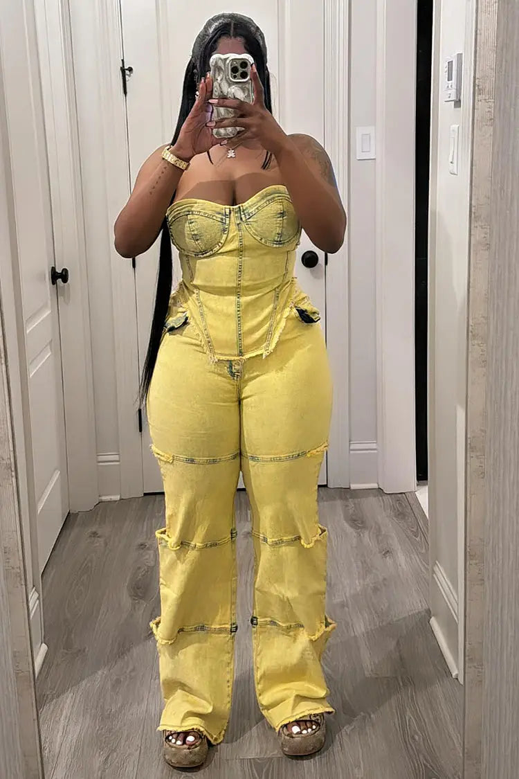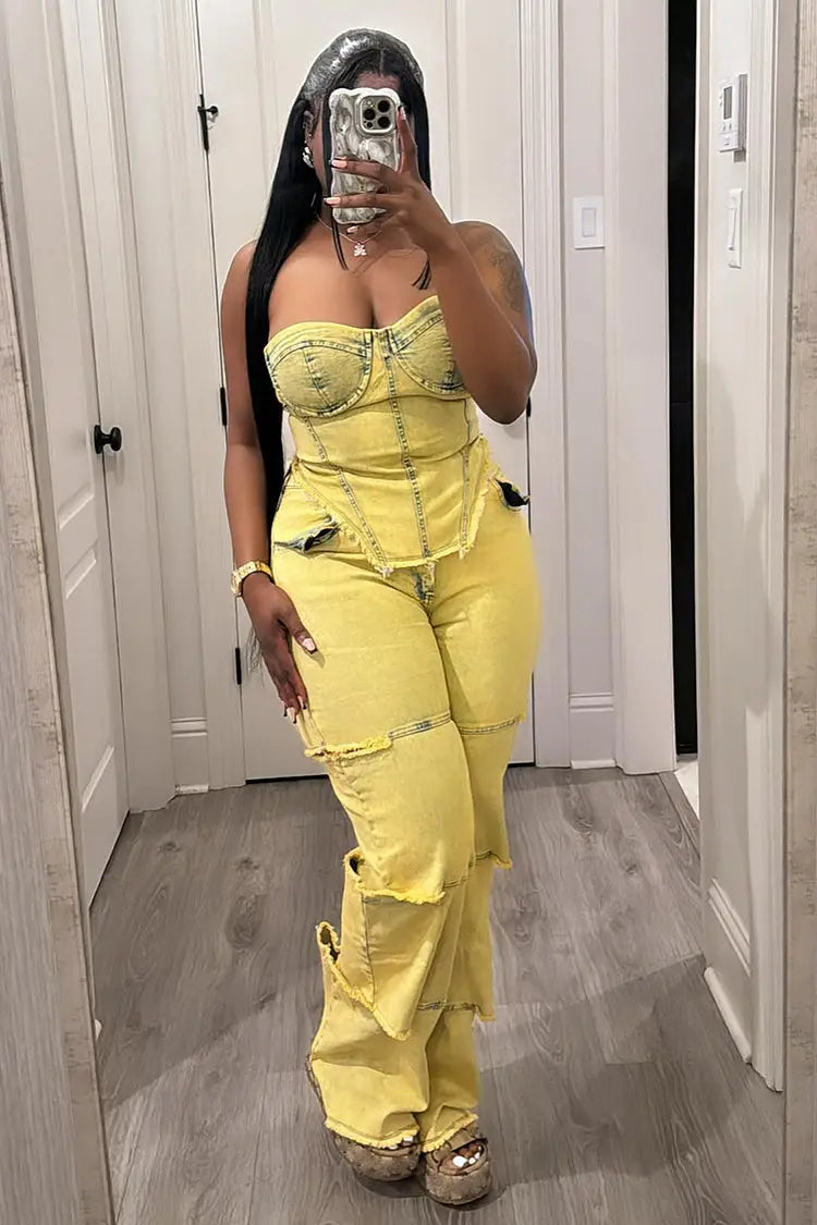 Expertly designed for bold, confident women, the FZ Women's Strapless Irregular Top Cutout Denim Pants Suit exudes style and sexiness.